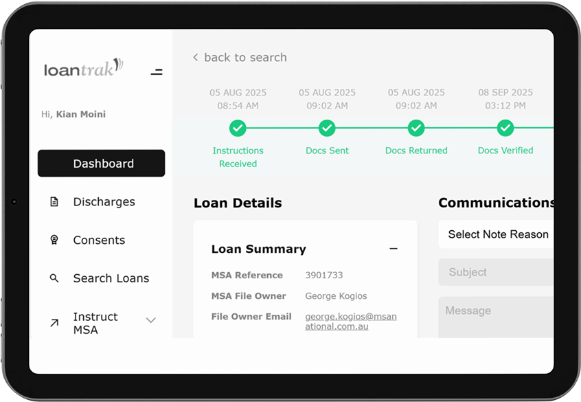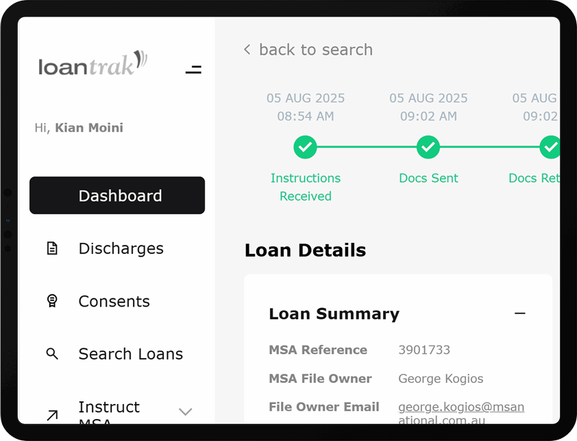 See the loan status instantly & visualise next steps to speed up settlement. LoanTrak is available for all of your loans for Lenders who are partnered with MSA National.